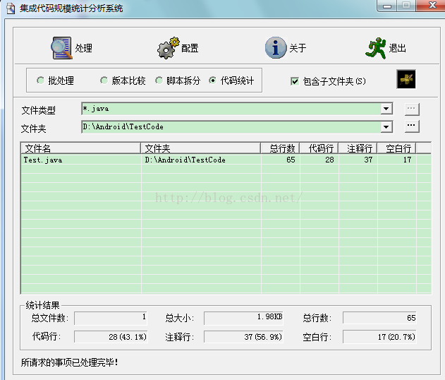 2. 选择好文件类型和文件夹后,点击处理就可以开始代码统计工作,通过选择文件类型,可以实现对不同类型的代码进行分别统计的目的。