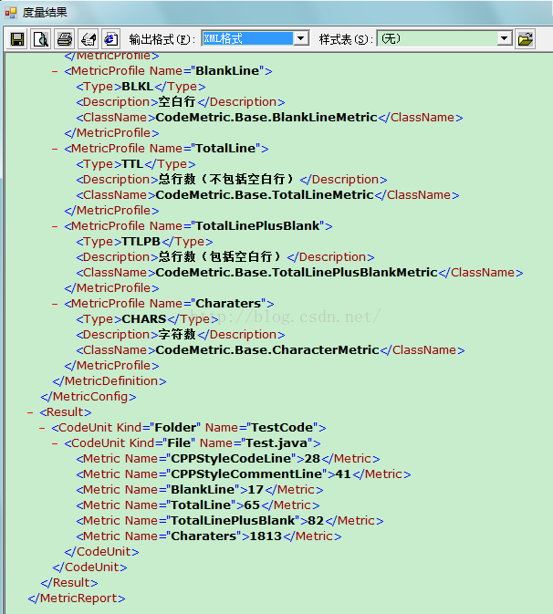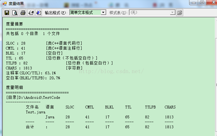 代码统计主要包括:注释行、空白行、代码行、总行数(不包括空白行)、总行数(包括空白行)、注释率、空白率、字符数。(也就是下图里面的度量项)